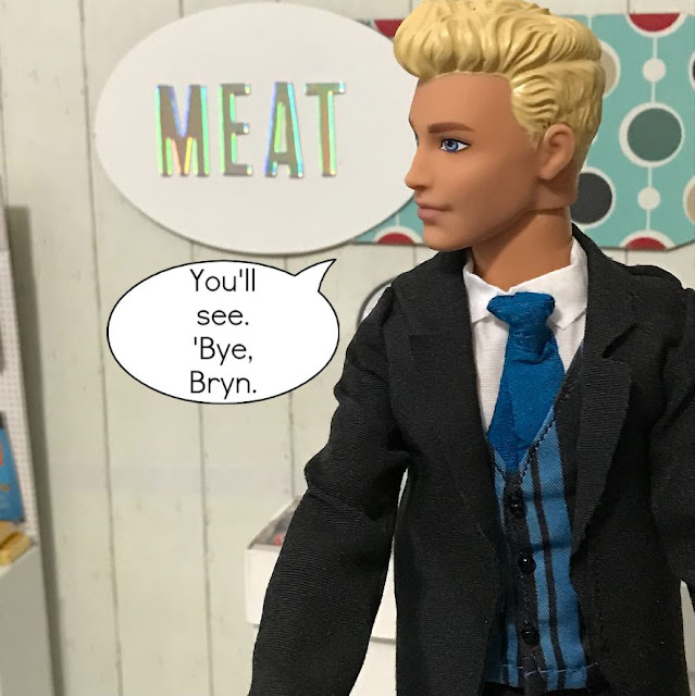 In the Season 2 episode "Born Under A Bad Sign," Sam finds himself covered in blood in an unfamiliar motel room with damask curtains and the blandest landscapes known to man. I chose this room to be Benny Lafitte's room in the magical A-Frame. Above, a behind-the-scenes view of the room set up in my disassembled A-Frame. Each of my dioramas takes up a minimum of two (usually 3 or 4) rooms of The Barbie A-Frame Dreamhouse, so I take the majority of photos in the disassembled doll house. The Larson's Landing Motel re-uses the large headboard seen many times on Supernatural. In fact, Benny shares this headboard with Sam Winchester. The bedding is also reused frequently. I originally made Benny's green chenille dotted bedspreads for a different motel room. I made the mid-century modern wallpaper on my computer. The damask drapes and matching lampshade are scrapbook paper. To the right you can see the unfinished fishing-theme...
