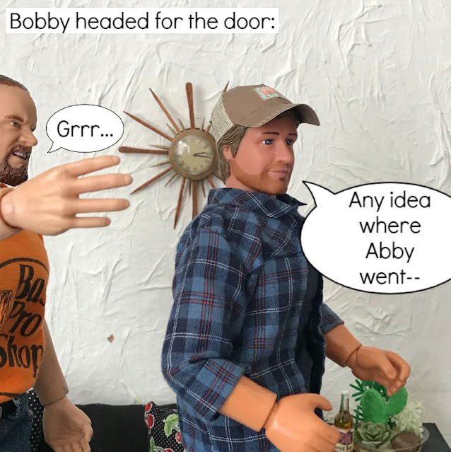 Leaving Roscoe Monroe chained up in the basement cell, the two hunters rushed out to find Abby and Delos: